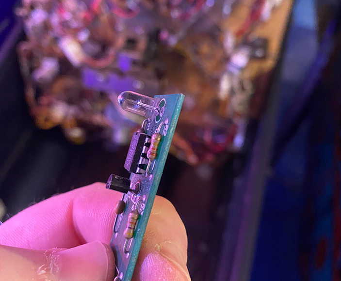 The next step was to remove the faulty opto LEDs. This required carefully accessing the affected circuit boards beneath the playfield and desoldering the bad components without damaging the traces. Opto assemblies can be delicate, and the infrared LEDs aren’t always visibly burnt out, so each one had to be tested with a camera or multimeter before replacement. Once confirmed, I desoldered the non-working LEDs, cleaned the solder pads, and prepared the board for the new parts.